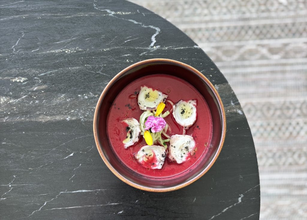 El menú especial arranca con un gazpacho de remolacha con pulpo y tallarines de pepino, un guiño visual al telón de terciopelo que se alza cada noche para dar paso a Christine, la dulce protagonista del musical. Como plato principal, se sirve un lomo bajo madurado con salsa café París, un homenaje al propio Fantasma —Erik—, criado y forjado en las entrañas de la ópera, profundo y lleno de matices.