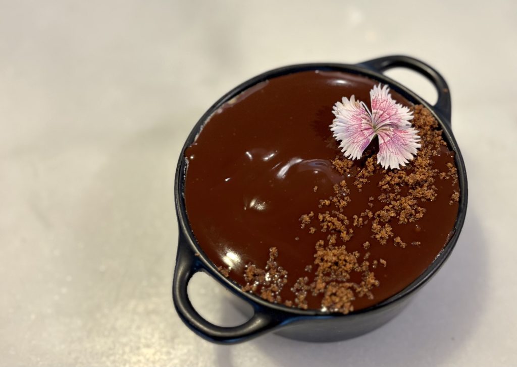 Para culminar, el postre traslada al comensal a la alta pastelería francesa con una reinterpretación de la clásica tarta Ópera: capas de bizcocho de almendra (joconde), ganache de chocolate, crema de mantequilla al café y glaseado brillante. Cada capa evoca los pisos del escenario y el refinamiento de una velada operística.