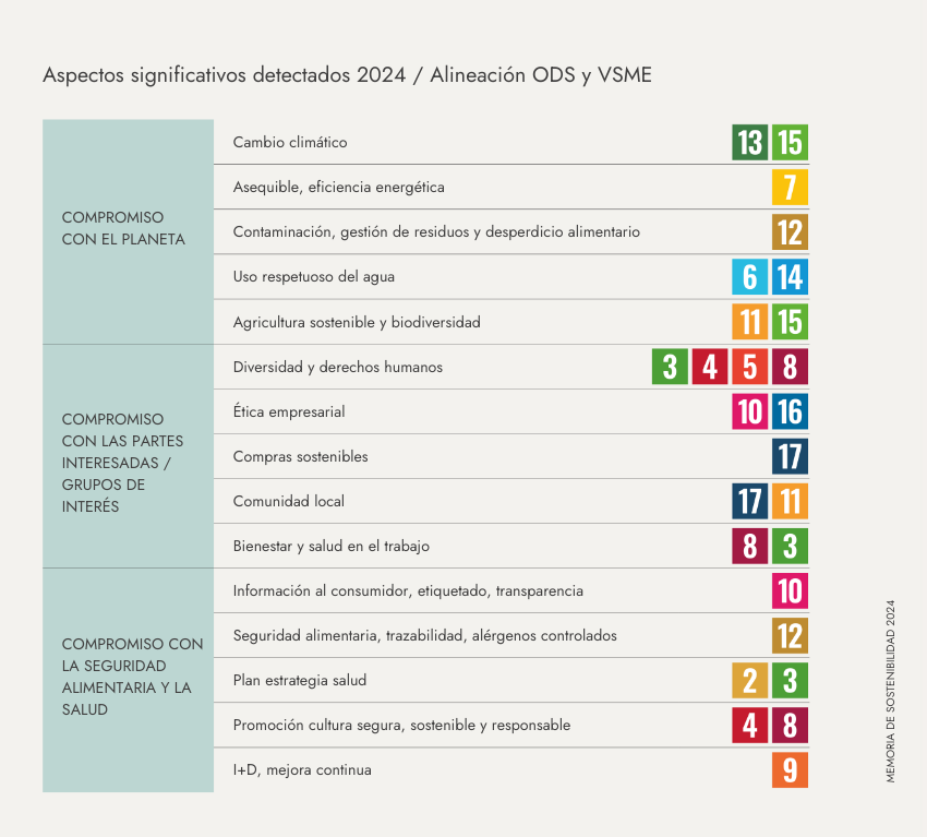 We identify the areas of greatest impact within our activity and align them with the Sustainable Development Goals (SDGs) of the 2030 Agenda. This analysis allows us to prioritise actions in areas such as the environment, social responsibility, business ethics and food safety, guiding our strategy towards more responsible, measurable and transparent management.