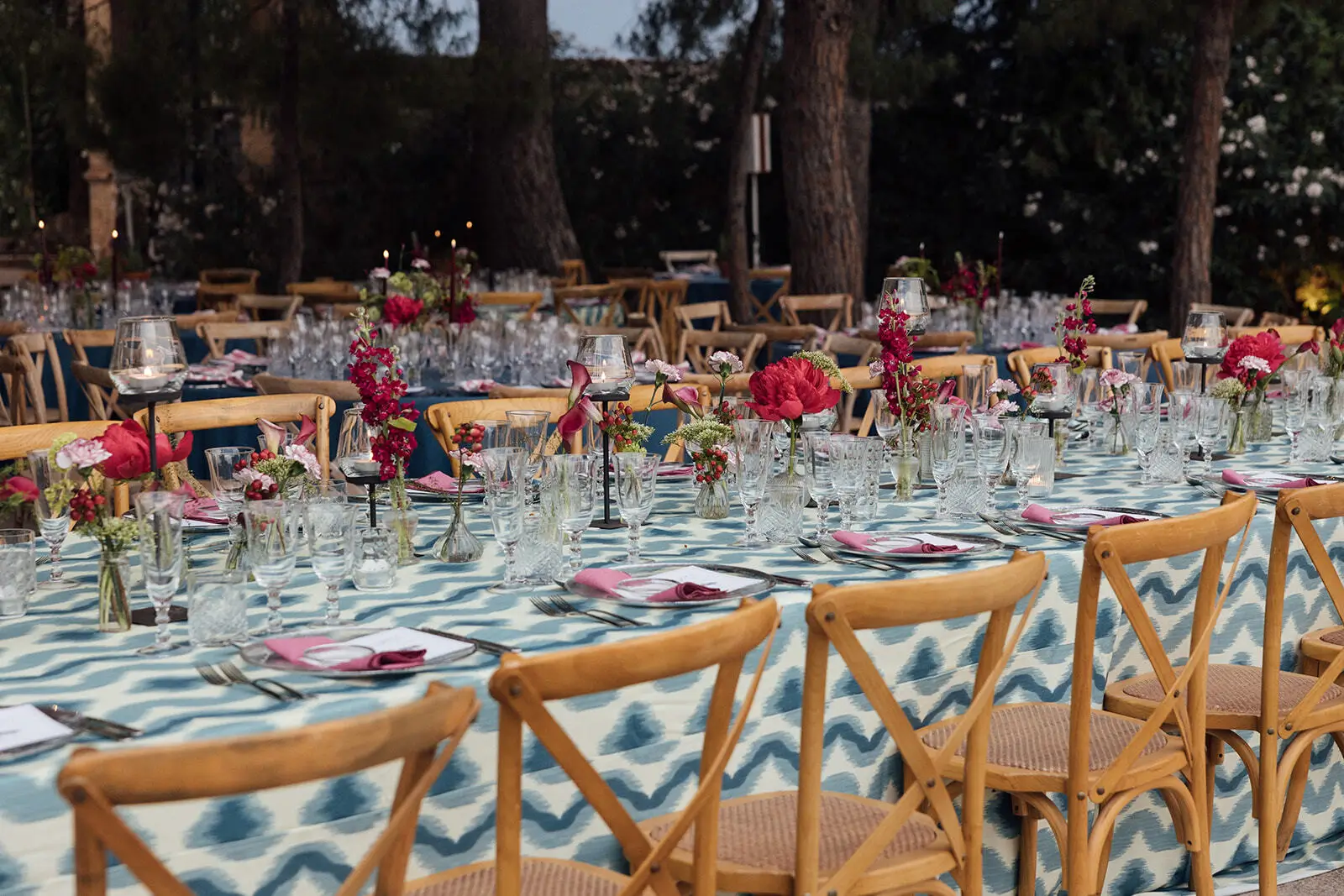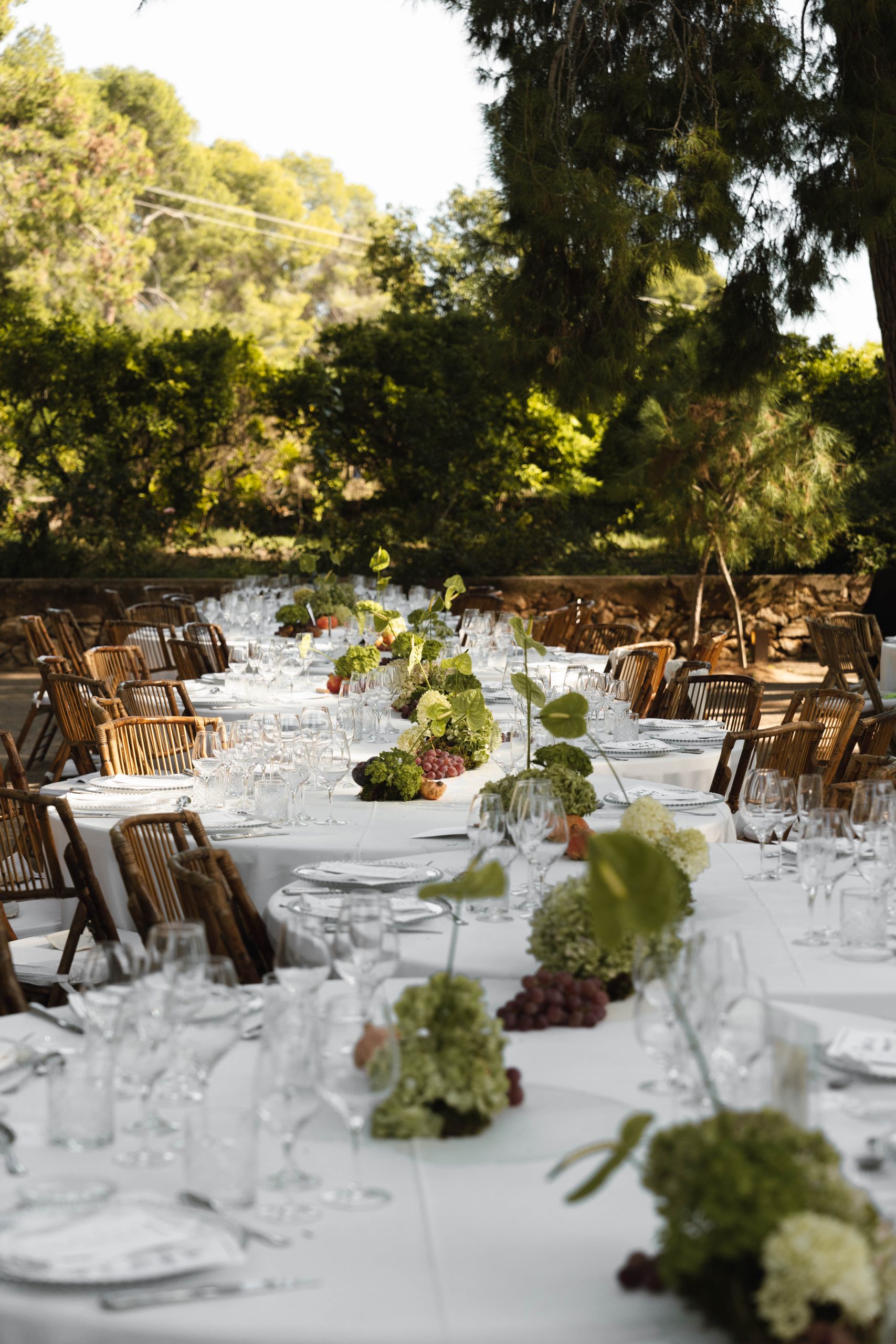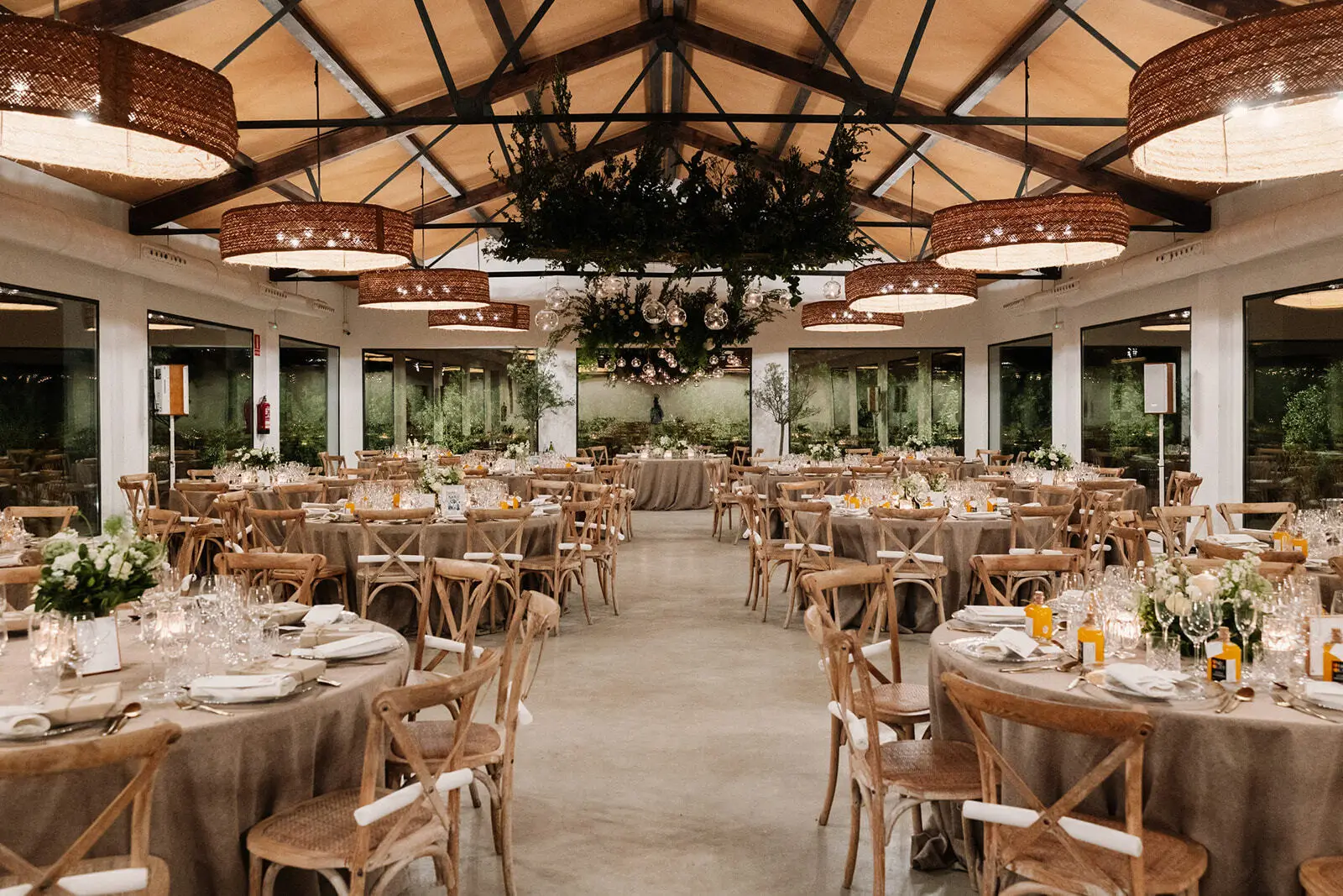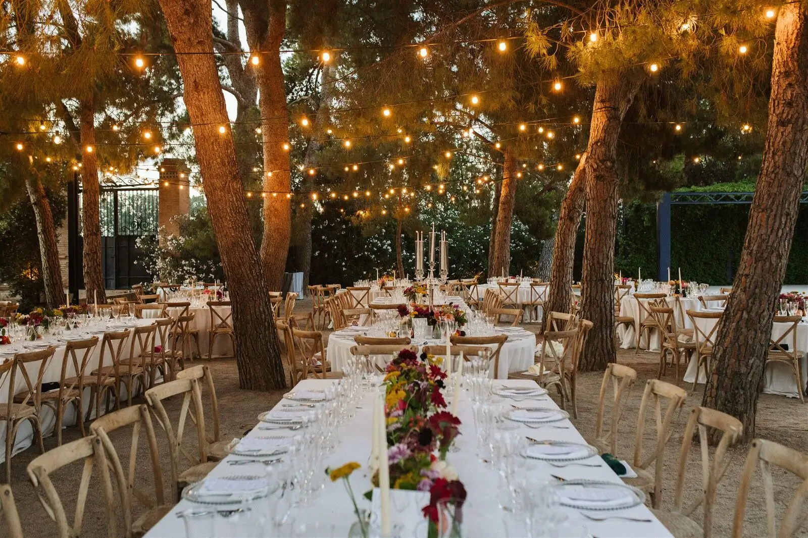 It is perfect for weddings, day and night, since its atmosphere is transformed by the light of the environment: from a snack in between orange trees at sunset to a dinner under a beautiful wide pine forest full of fairy lights. Additionally, with areas indoor and outdoor, offer total versatility throughout the year.