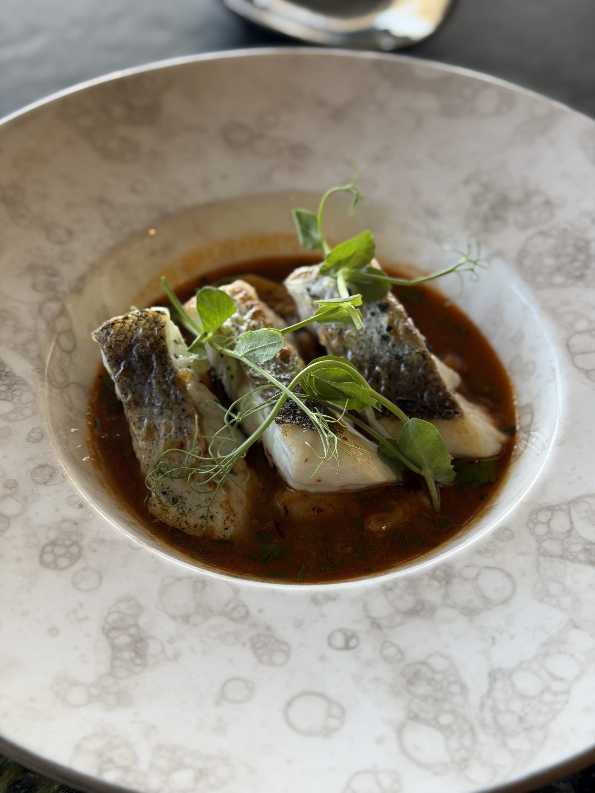 The second step takes the diner to the core of the drama with a skewered hake stew, an intense dish that represents the emotional storm and the familiar pressures that separate the protagonists. He marries a Komokabras 2024 of Adega between the rivers (Albariño, A Pobra, A Coruña), whose freshness provides the luminous counterpoint of the truth in the midst of the conflict.