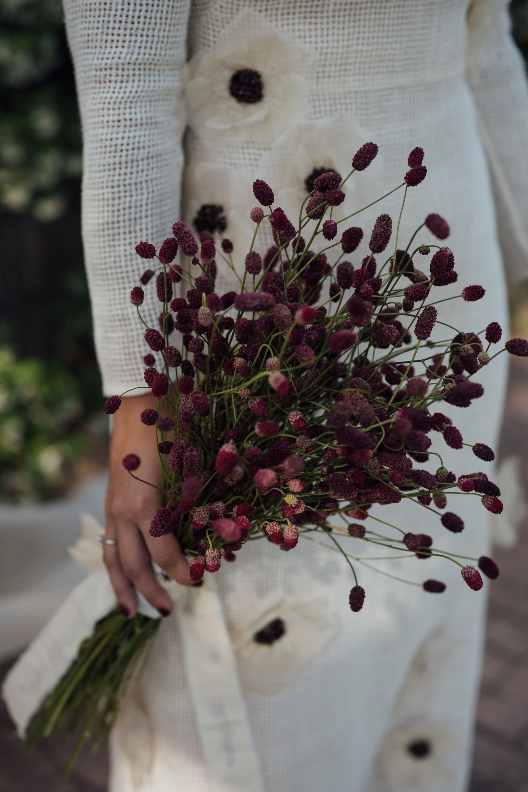 Low up and a sun-kissed effect makeup. The branch, designed by clo’s workshop, it was a minimalist proposal composed entirely of Sanguisorba.