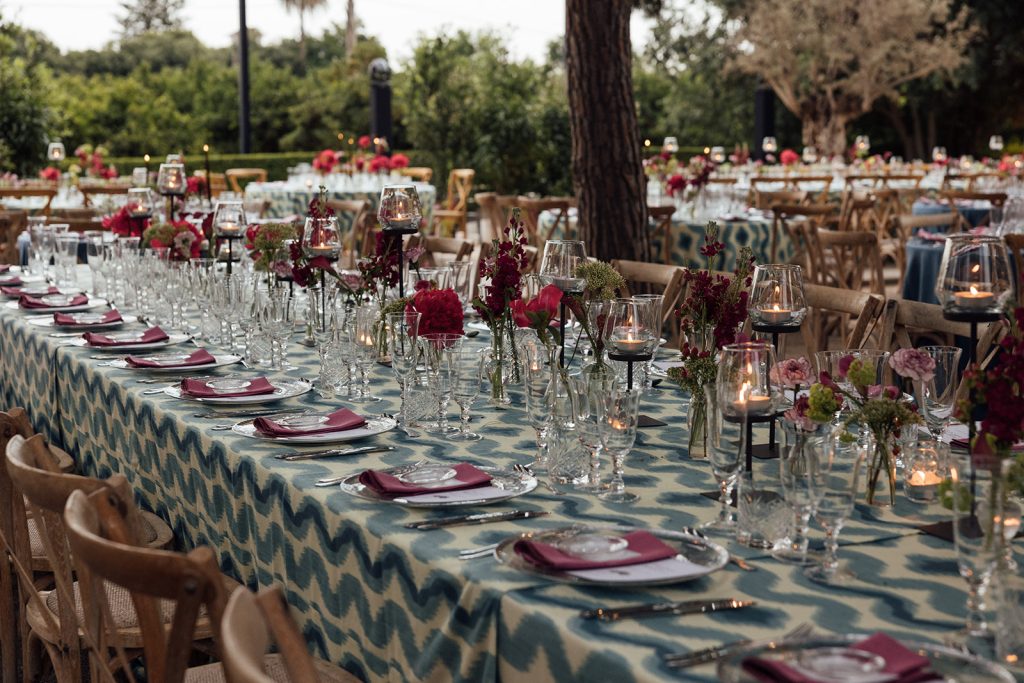 On the great imperial table, the tables wore tablecloths of Mallorcan lenghists —the iconic Balearic Ikat whose flames dyed by hand evoke the breeze of Tramontana—. A decoration in which the blue tones with bougainvillea prevailed and that teleported the guests to Formentera. The bride and groom were looking for the Mediterranean essence but with a fun and youthful concept that they achieved with the combination of colors, the choice of flowers and the sophisticated point of the magenta candles. The glassware, bass and carved glass chandeliers evoked the reflections of the sea water and were yet another nod to the Mediterranean.