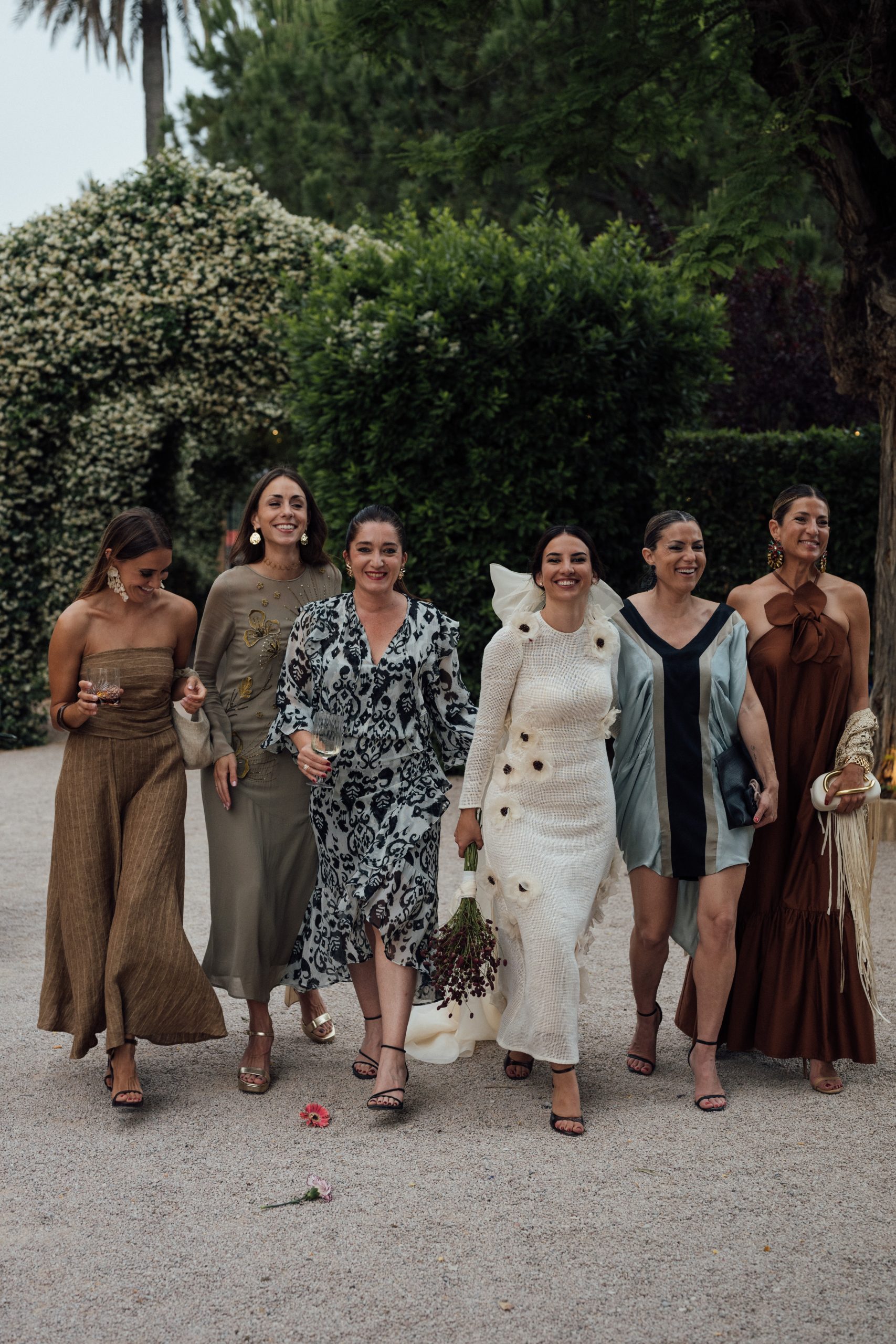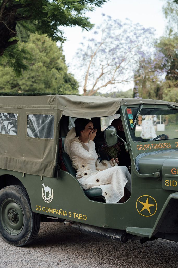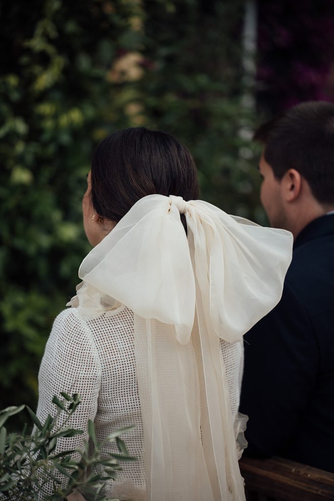 Paloma entrusted her nuptial dream to Edgar Molina Atelier, which created a dress that evokes a bucolic femininity, with original flowers of natural silk organza, finishing off the look with a veiled loop that floated like a Latin candle at sunset. Completed the look with metallic sandals signed by Lola Cruz, while the make-up artist and hair stylist Mireia Costa opted for a