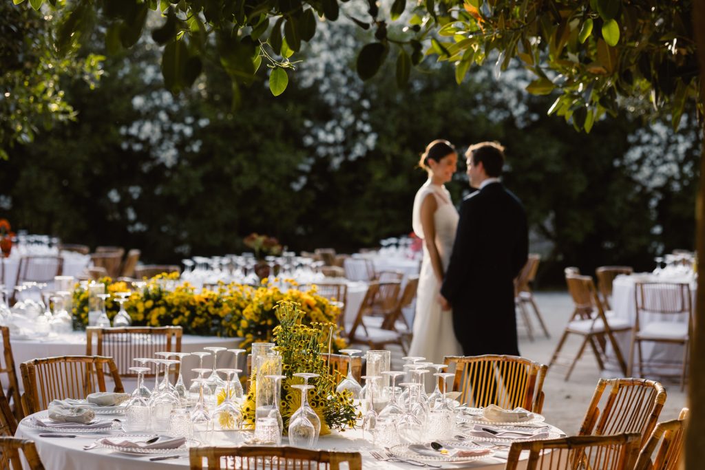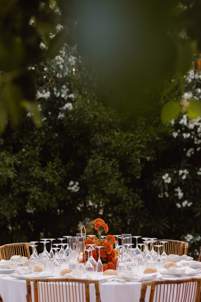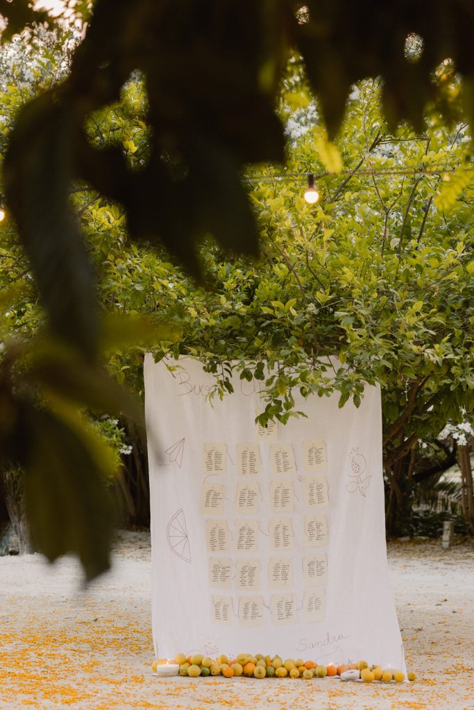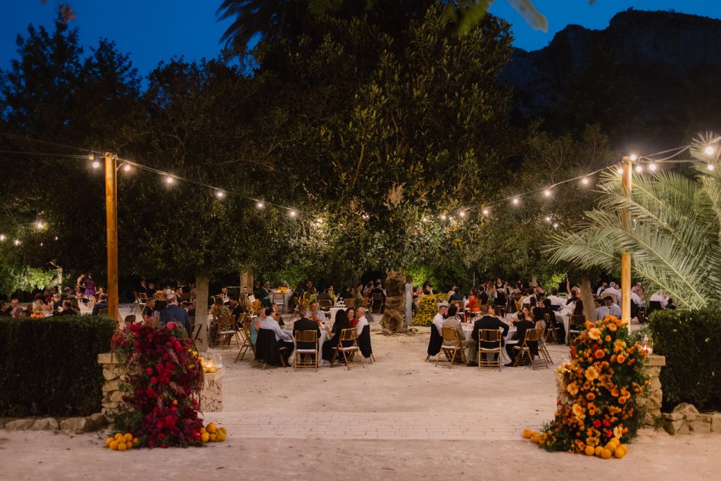 Sandra was certain from the very beginning: she wanted the wedding to breathe a very specific atmosphere. “A Midsummer Night’s Dream” became the guiding thread, and as every great story needs a symbol, the orange blossom took on the role of the celebration’s emblem. It formed an emotional bridge between Sandra’s Murcian roots and Jose’s Valencian heritage, appearing in the dress, the decorative details, and even in the bespoke emblem designed by the bride’s brother.