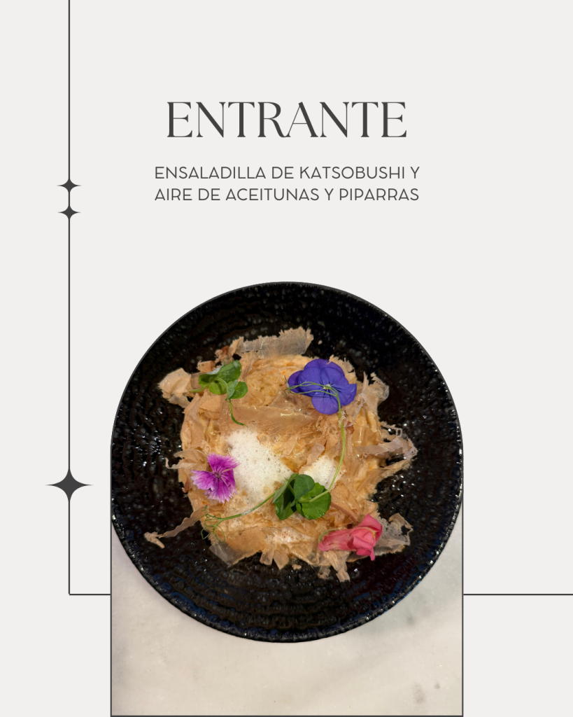 To start, the katsobushi salad with olive foam and piparras presents a subtle reinterpretation of the classic salad, infused with salty and umami notes. The lightness of the katsobushi evokes words written and unspoken, while the olive foam and the sharp touch of the piparras introduce the underlying tension that runs through the opera from its very first scenes.