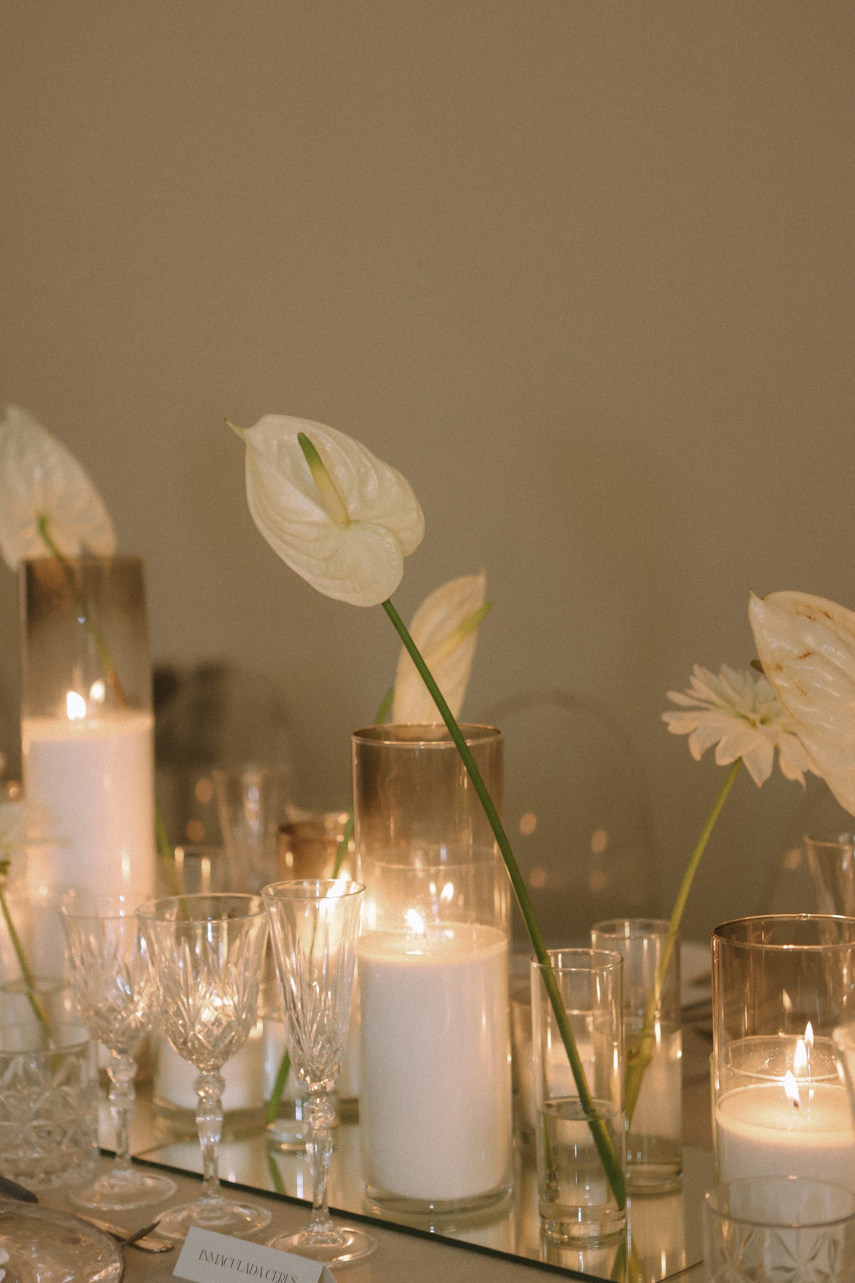 Conceived as an immersive experience, the dinner was deployed between musical performances and acrobatic numbers embedded in an organic way. The visual composition opted for a symmetry clear that emphasized the central nave: two long tables as axes protagonists and the table of the bride and groom occupying the heart of the space. Each item was chosen with precision so as not to compete with the power of the architectural environment.