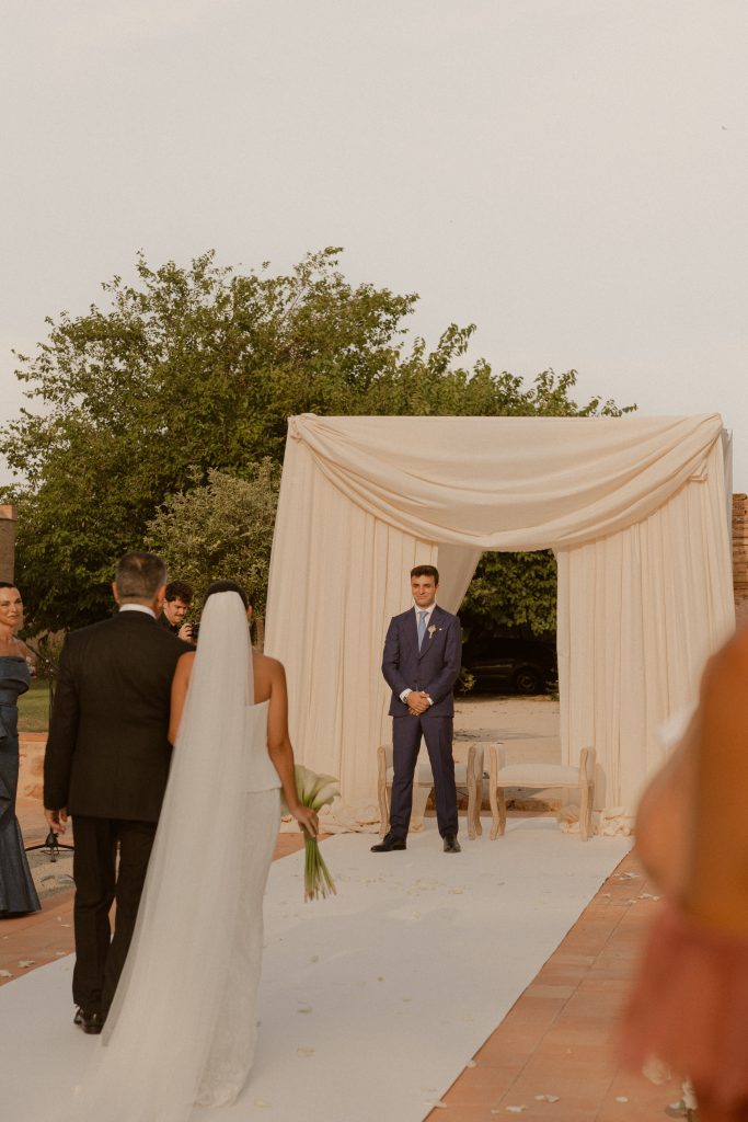 Nos gusta pensar que las bodas estivales empiezan realmente cuando el sol comienza a bajar. Ese momento en el que la luz se vuelve dorada, las sombras se alargan y el aire se suaviza. Es la hora perfecta para una ceremonia al aire libre, cuando todo parece más cinematográfico, más íntimo, más suspendido en el tiempo.