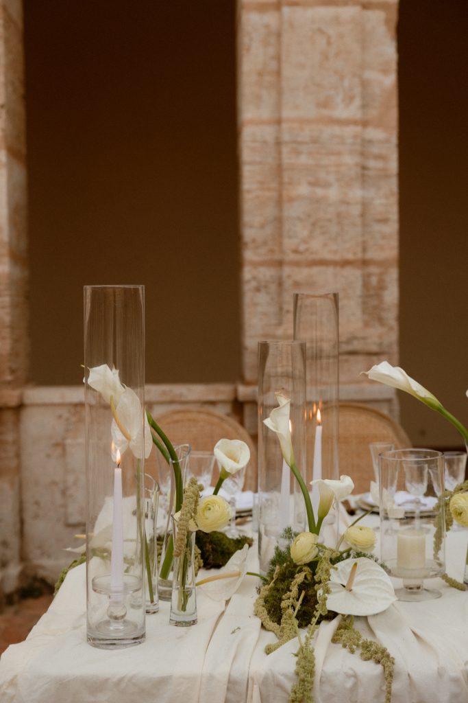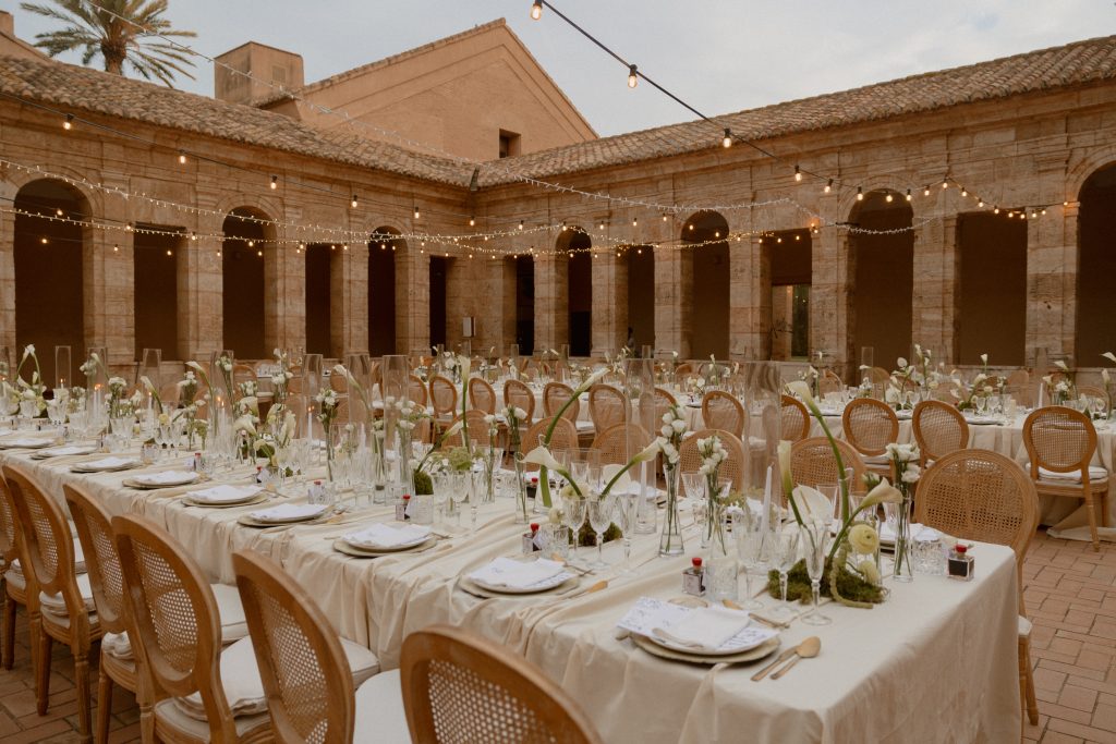 Las mesas también se transforman. Las bodas de verano permiten composiciones más relajadas, más naturales. Flores ligeras, velas que empiezan a encenderse cuando cae la noche, copas que brillan bajo guirnaldas de luz. Todo ocurre en capas, poco a poco, mientras el cielo cambia de color.